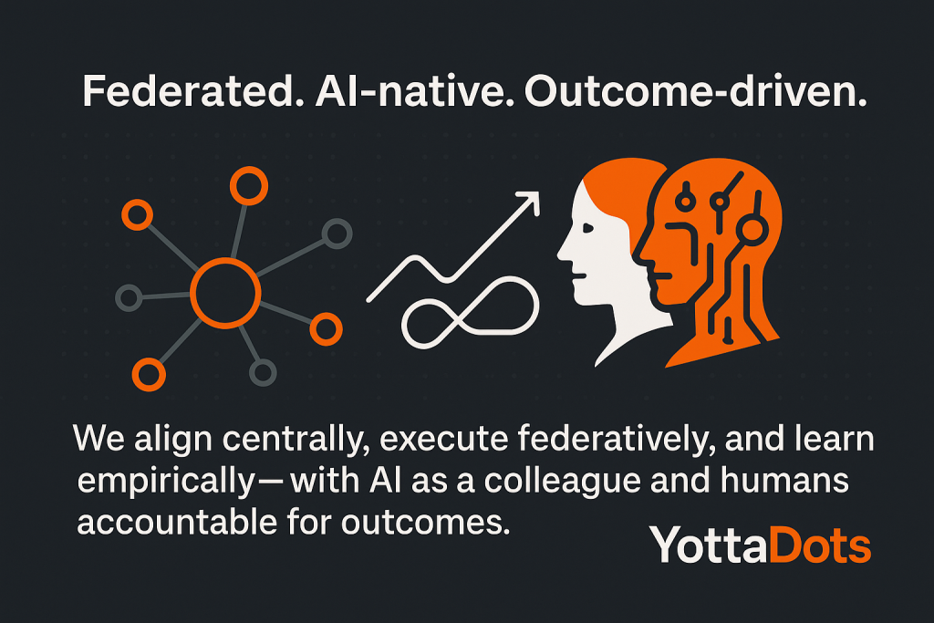 Federated. AI‑native. Outcome‑driven. We align centrally, execute federatively, and learn empirically— with AI as a colleague and humans accountable for outcomes.